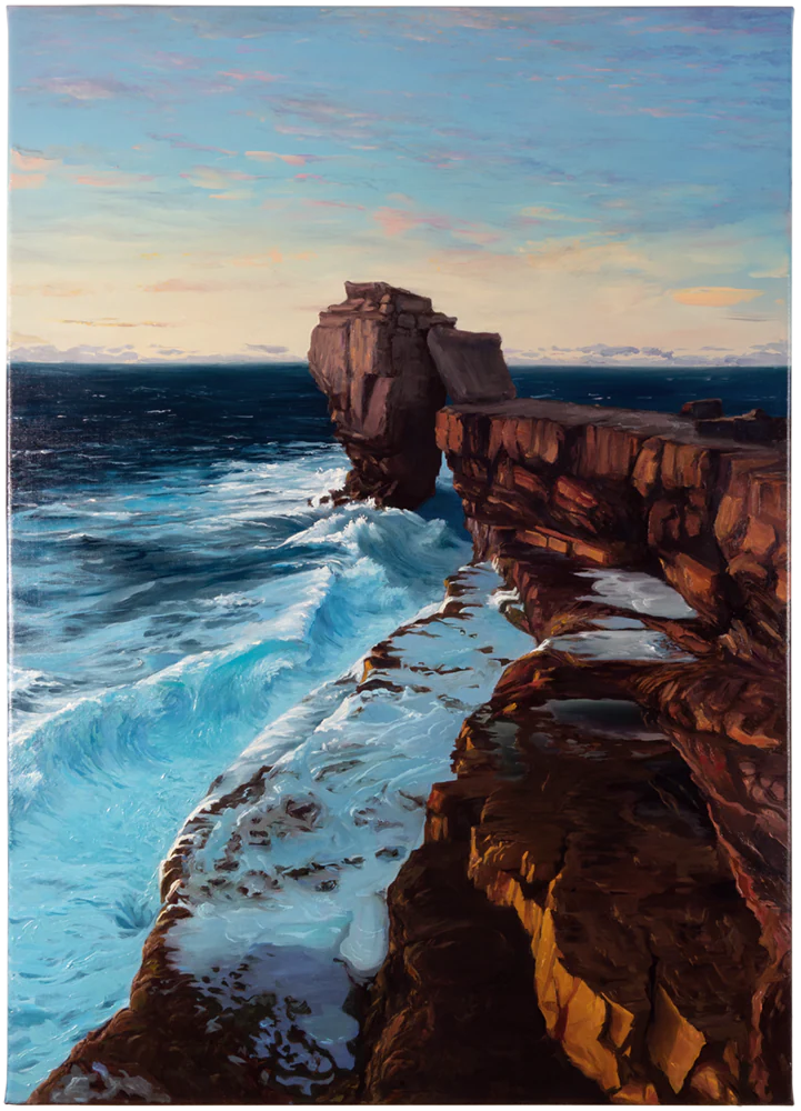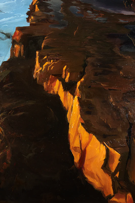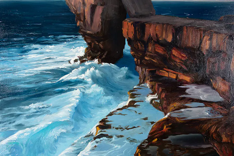Przedstawiony olejny pejzaż morski ukazuje skalny cyple i rozbijające się o niego fale. Dominujące kolory, takie jak pomarańcze i brązy skał, harmonijnie kontrastują z błękitem morskiej piany i granatem morza, które powoli znikają za horyzontem. Opis ten ma charakter stonowany i profesjonalny, nie popadając w patos. Obraz ten doskonale oddaje piękno i siłę natury, przenosząc widza w malownicze wybrzeże. Pejzaż morski, skalne cypel, rozbijające się fale, pomarańcze, brązy, błękit, granat, horyzont, natura.