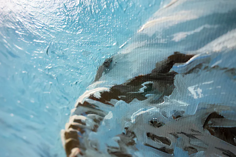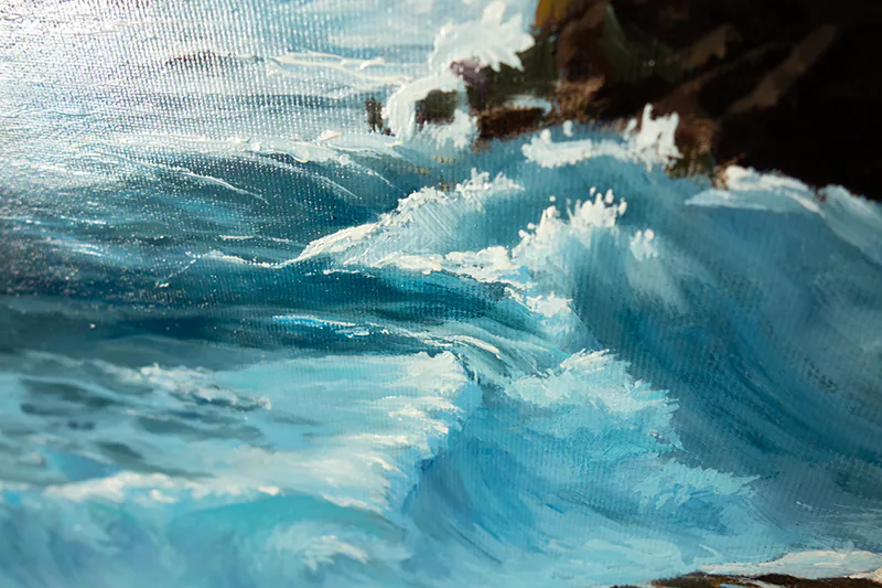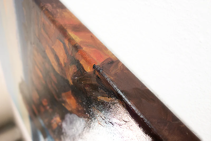 Obraz wykonany na gotowym podobraziu bawełnianym jakości premium. Malatura po zaolejowaniu, wyschnięciu pokryta werniksem błyszczącym na bazie żywicy syntetycznej Regalez, usuwalnym za pomocą standardowych rozpuszczalników stosowanych w malarstwie olejnym.