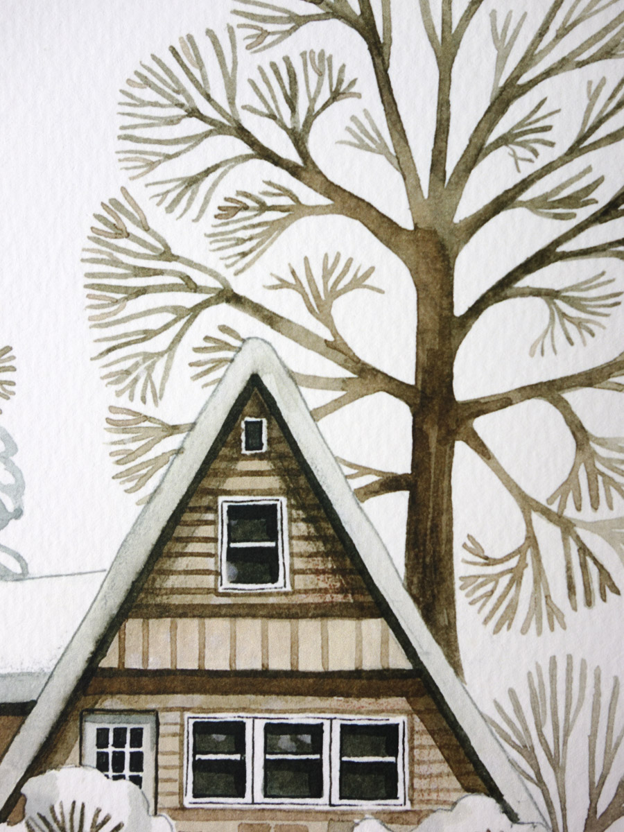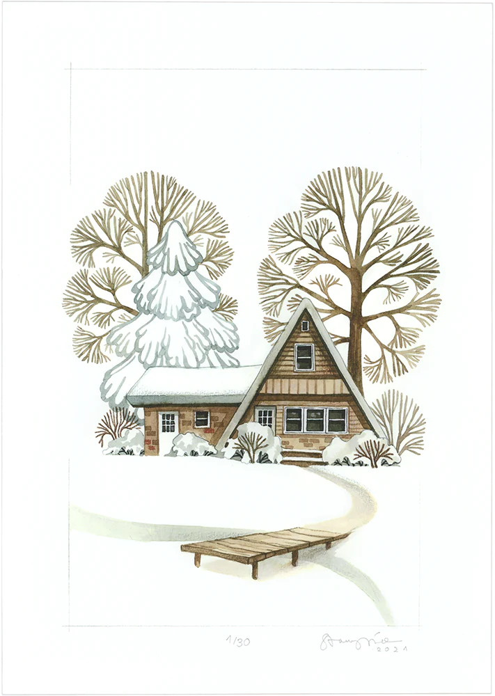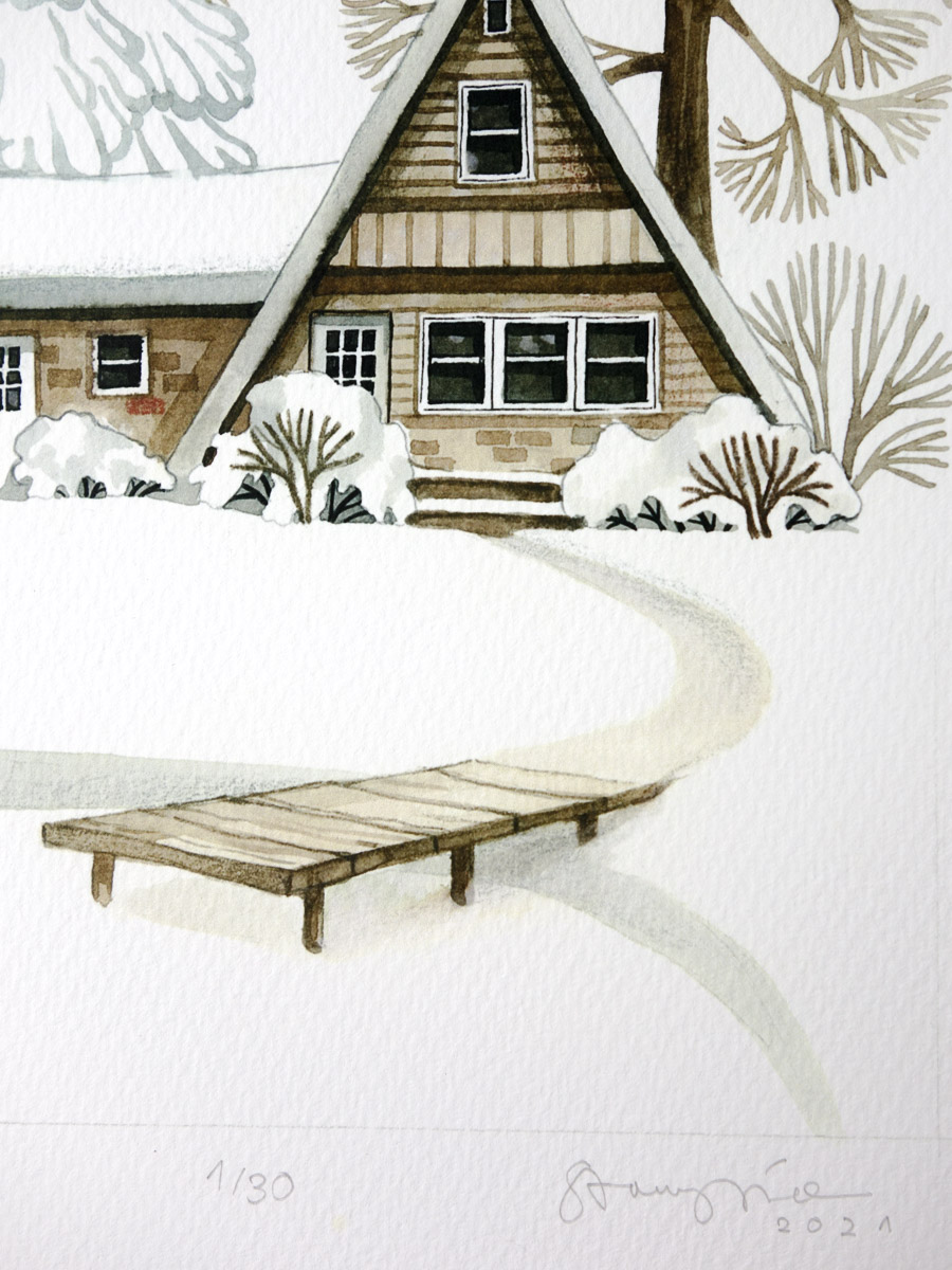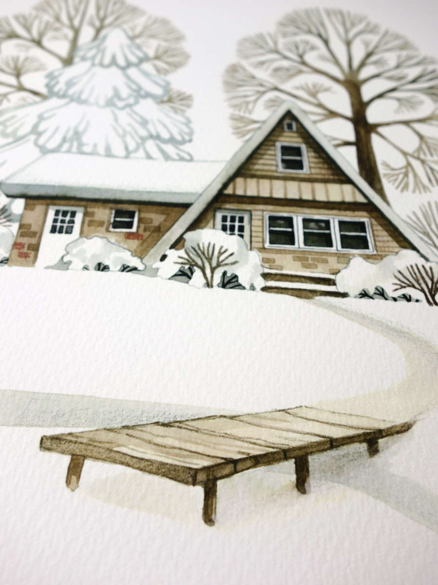 Tematem ilustracji jest zimowa sceneria. Przedstawia domek otoczony ośnieżonymi krzakami i drzewami. Na pierwszym planie pomost nad skutym lodem jeziorem. Domownicy cenią sobie spokojny, biały krajobraz i mroźną ciszę, ale może zdążyli już zatęsknić za latem i czekają aż słońce ogrzeje jezioro i znowu będą mogli skakać z mola?